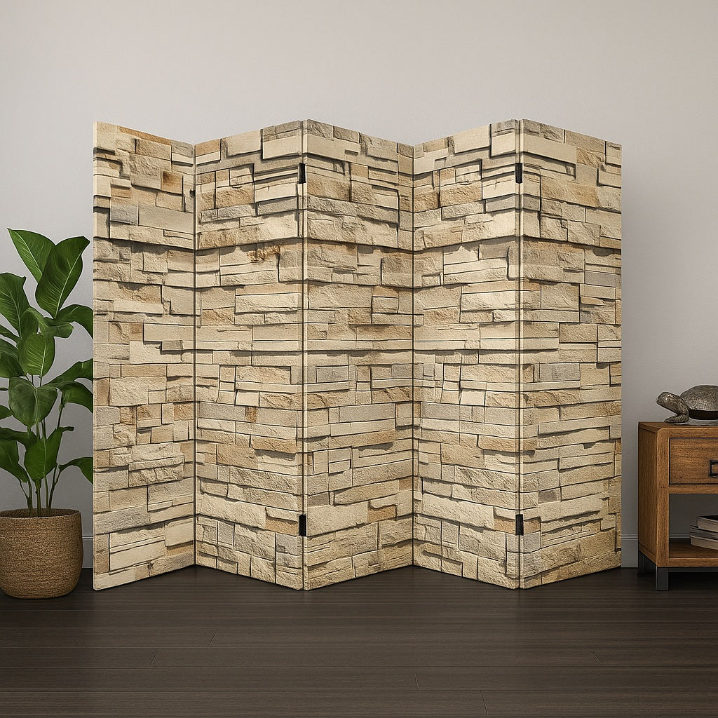 Bestel nu en transformeer je ruimte met dit sfeervolle kamerscherm in een warm beige natuursteenmotief (zandkleurig steenmotief).