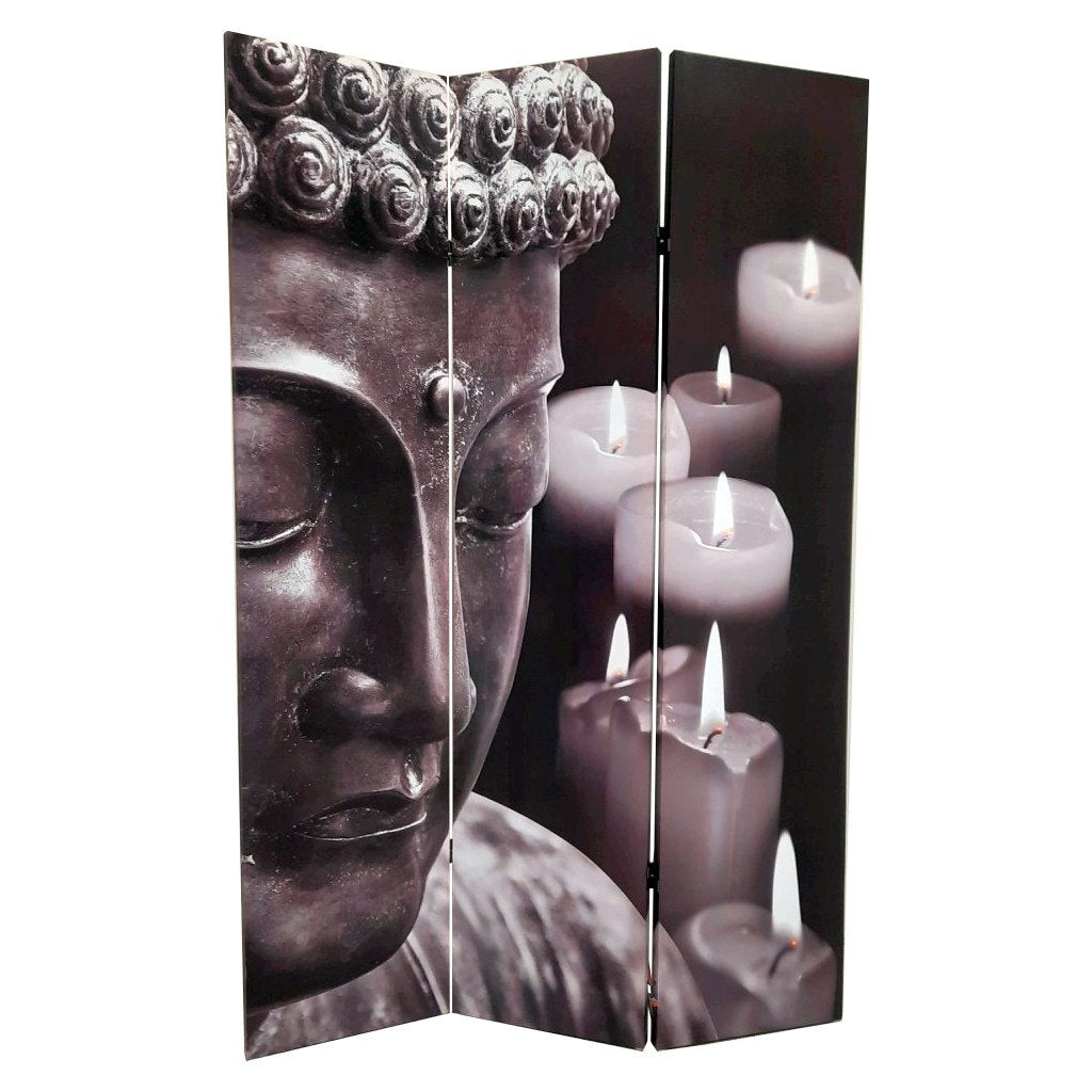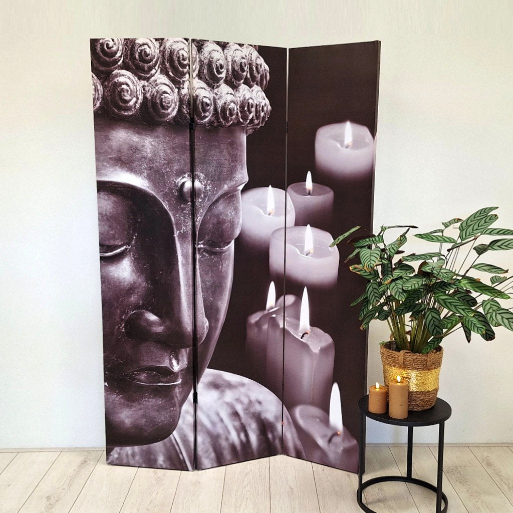 Breng rust en sfeer in je interieur met dit 3-delige Boeddha kamerscherm. Het houten frame is bespannen met stevig canvasdoek en voorzien van een prachtige print van een serene Boeddha, gecombineerd met sfeervolle kaarsjes op het rechter paneel. Dankzij de subtiele zwart-wit look met warme brons- en aardetinten is dit scherm een echte blikvanger. Perfect voor gebruik in de woonkamer, slaapkamer, praktijkruimte of salon.