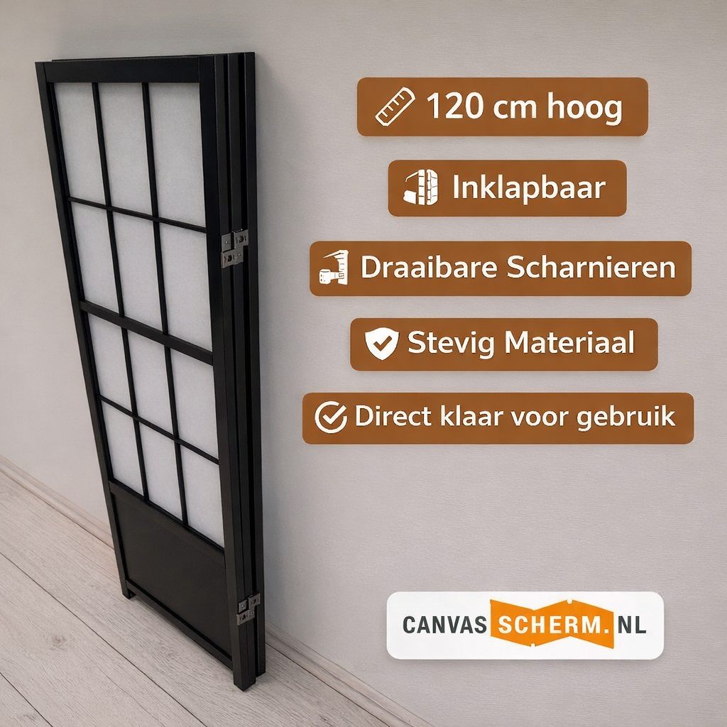 Let op: dit is een laag model kamerscherm met een hoogte van 120 cm. Dit scherm is klein in vergelijking met standaard kamerschermen, maar kan juist groot uitvallen als raamscherm. Controleer vooraf goed of de afmetingen passen bij jouw toepassing.