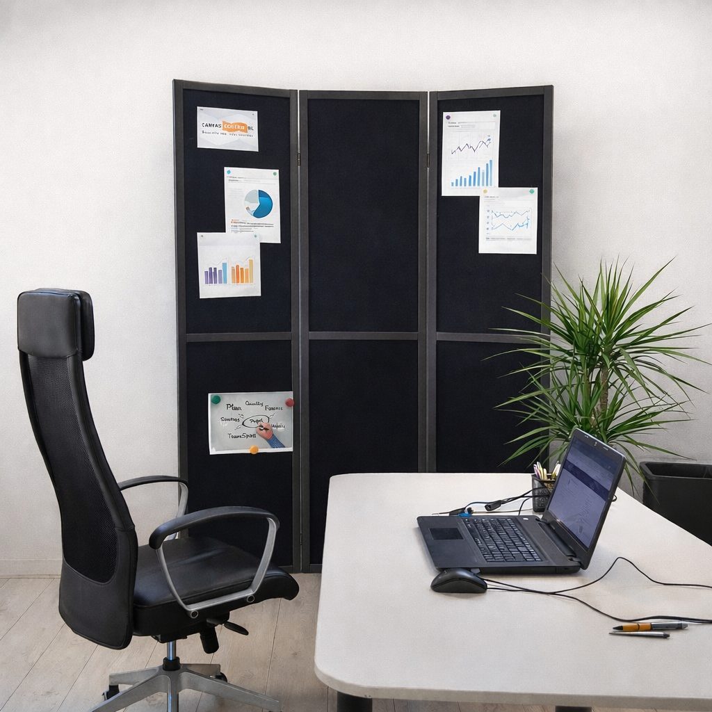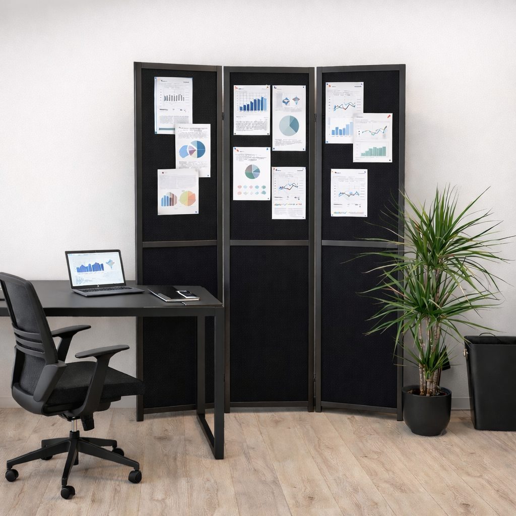 Dit zwarte houten kamerscherm met prikbord is een stijlvolle en functionele oplossing voor kantoor, werkruimte of thuis. Het scherm combineert privacy, flexibiliteit en presentatiemogelijkheden in één extra stevig ontwerp.
