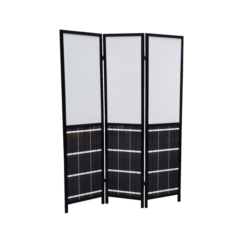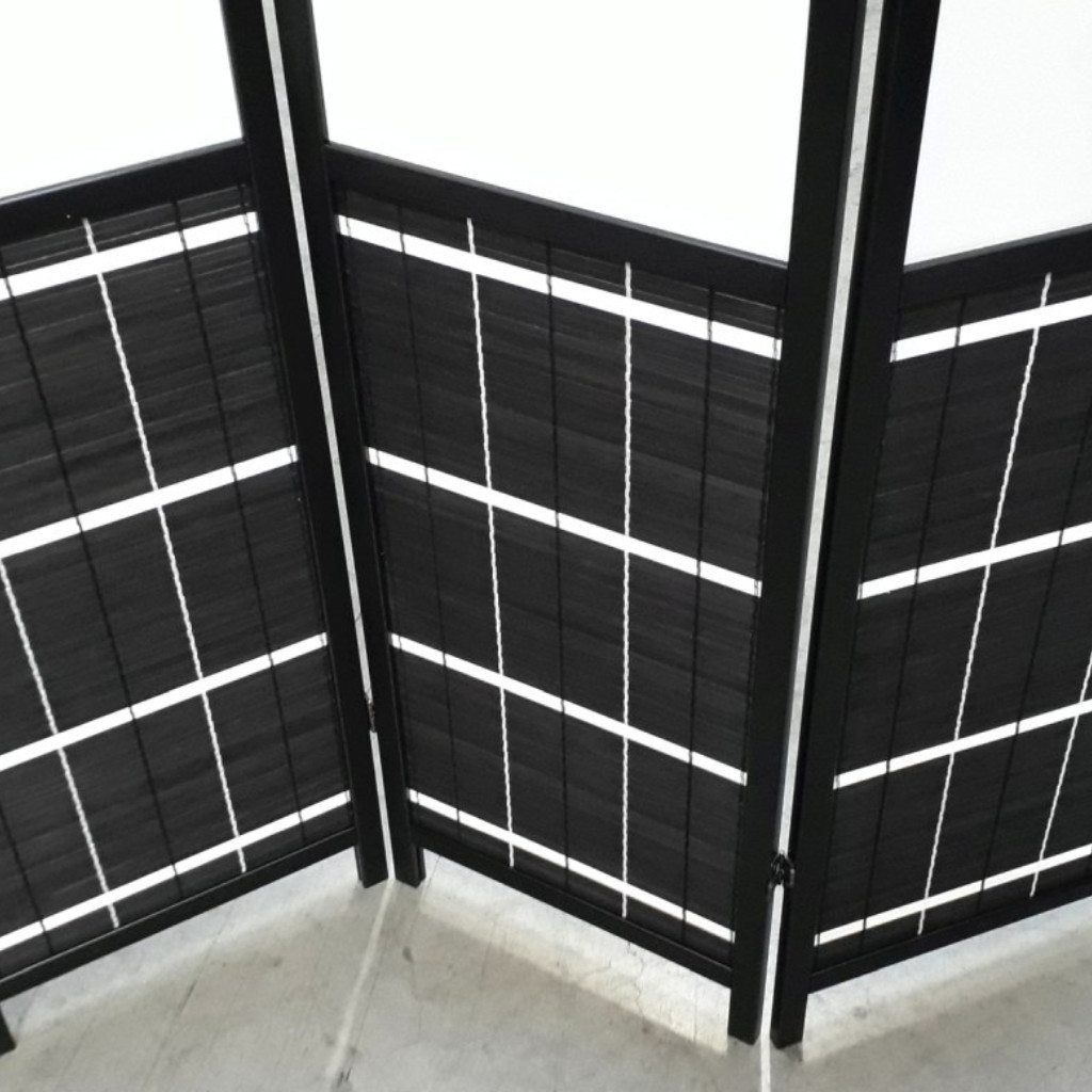 Het zwarte houten frame met licht transparante geweven houten inleg aan de onderzijde zorgt voor een rustige uitstraling. De metalen scharnieren draaien flexibel beide kanten op, waardoor je het scherm altijd in de gewenste vorm neerzet.