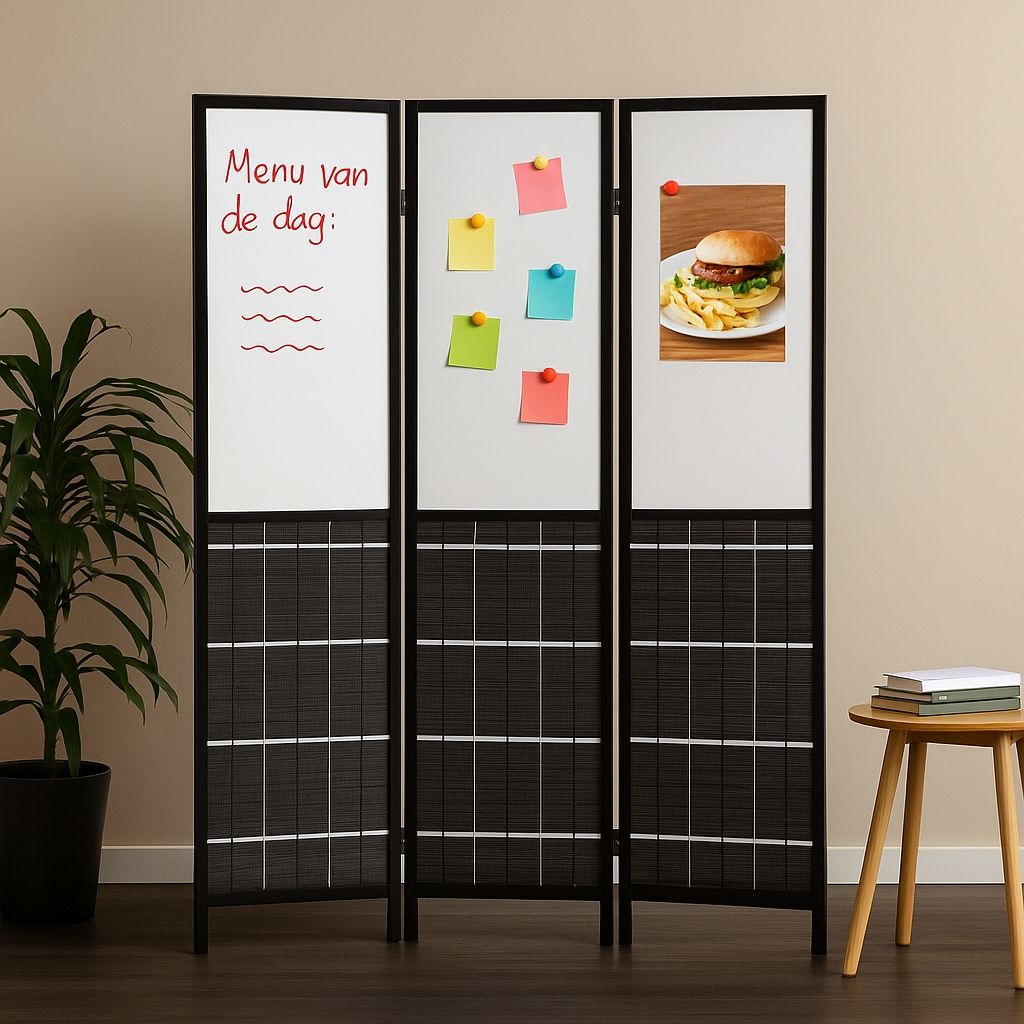 Zoek je een stijlvol en praktisch kamerscherm met whiteboardfunctie? Het Kamerscherm Tunica biedt privacy én een creatief schrijfoppervlak. Dankzij het verbeterde magnetische whiteboard aan beide zijden kun je eenvoudig notities, posters of memo’s ophangen met magneten. Ideaal voor gebruik in een kantoor, wachtruimte, praktijk, school of thuiswerkplek.