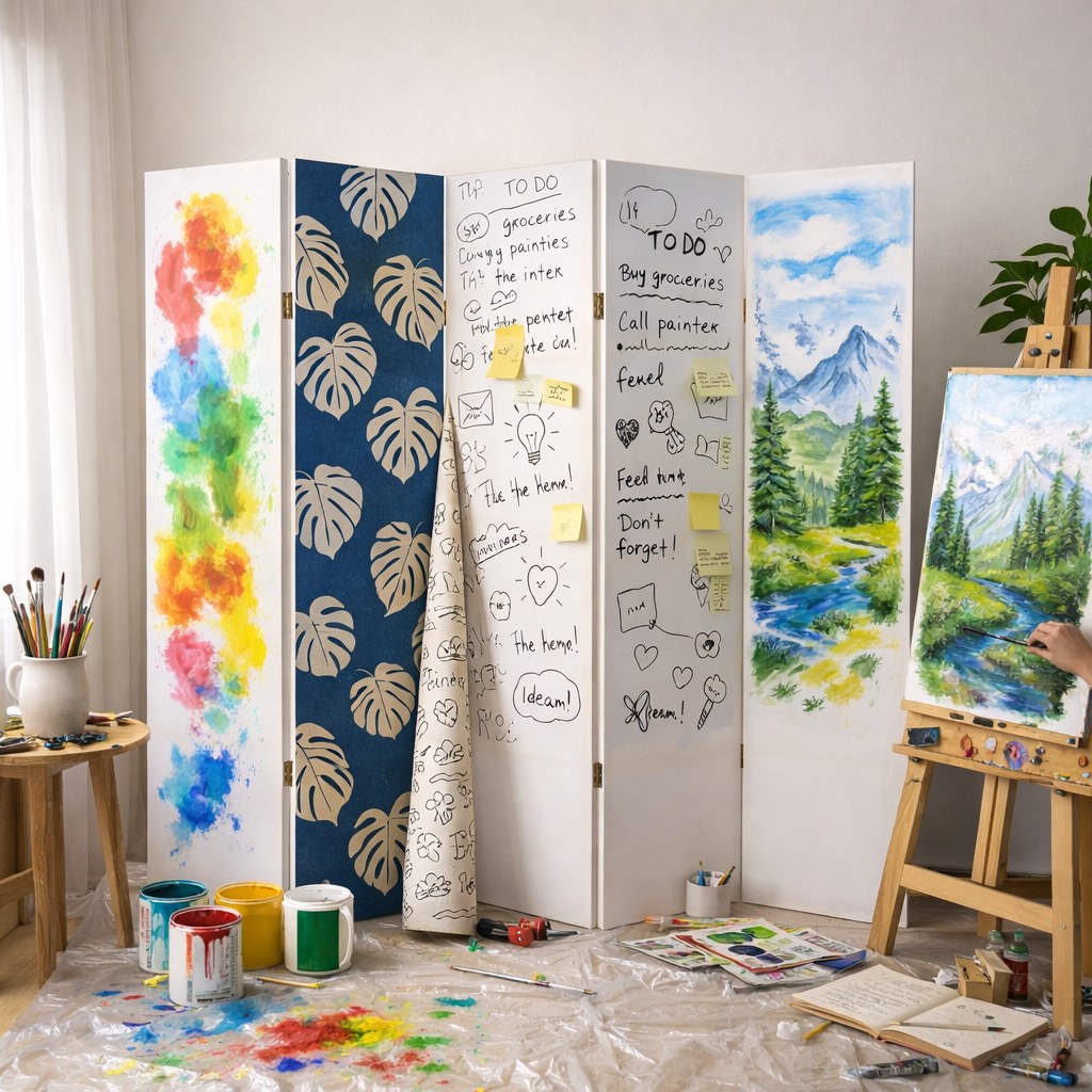 Het Wit Blanco Kamerscherm 5 panelen is speciaal ontworpen om naar eigen inzicht te personaliseren. Dit scherm biedt een veelzijdige basis voor creatieve projecten, ideaal voor toepassingen zoals: