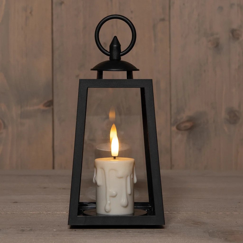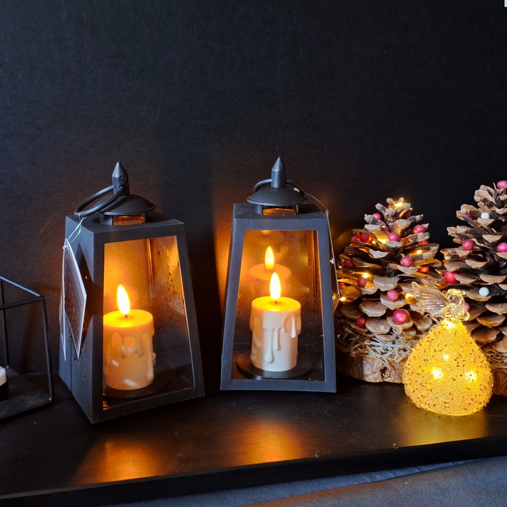 Creëer direct dubbele gezelligheid met deze set van 2 zwarte lantaarns. Elke lantaarn bevat een realistische LED druipkaars met 3D-vlamtechnologie, waardoor het lijkt alsof er een echte kaars brandt – maar dan zonder rook of brandgevaar.