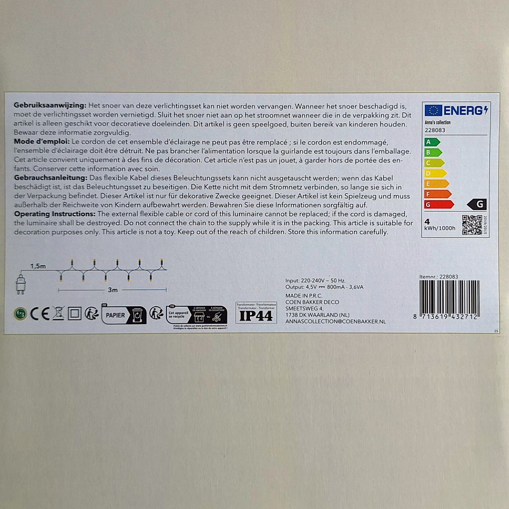 - Lengte lichtsnoer: ca. 300 cm (verlichte lengte)