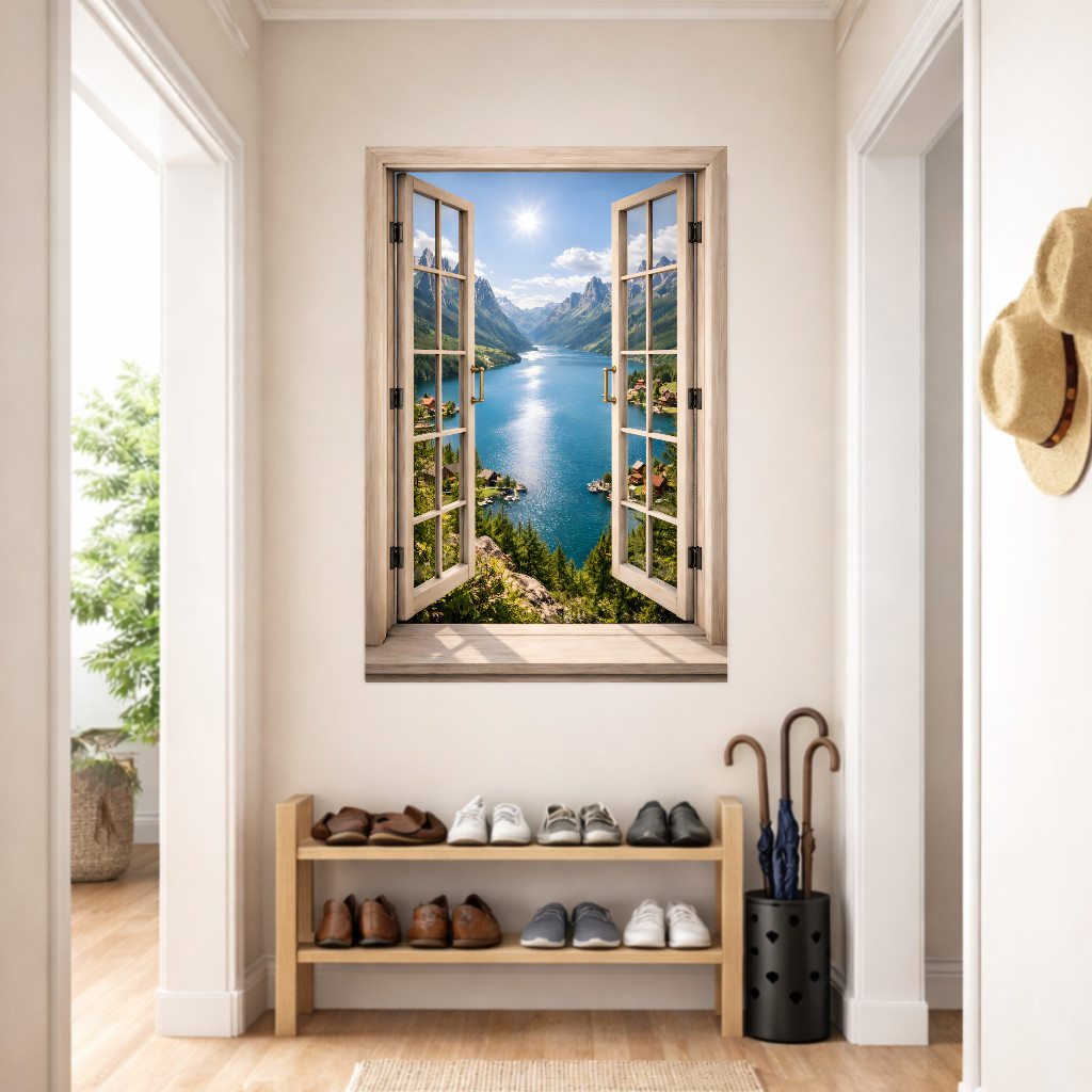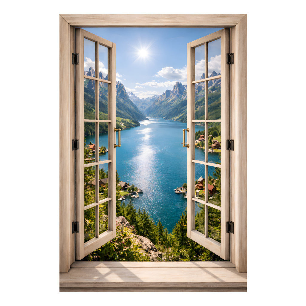 Muursticker Open Raam – Uitzicht op Bergmeer