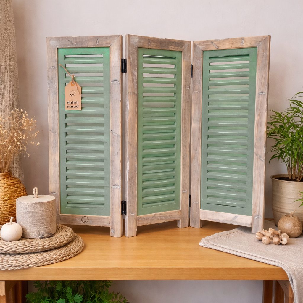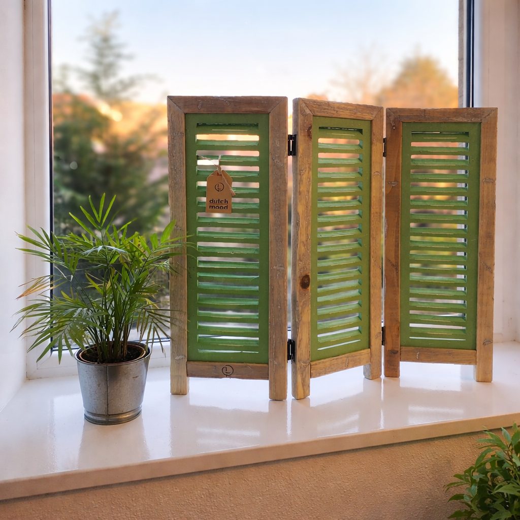 Dit drieluik raamscherm is behandeld met een unieke finishing om een authentieke verouderde uitstraling te verkrijgen. De schermen worden geverfd en daarna geschuurd, kenmerk hiervan is dat er nog wat stof vrij komt en er lichte slijtageplekken en witte vlekjes in de verflaag aanwezig zijn.